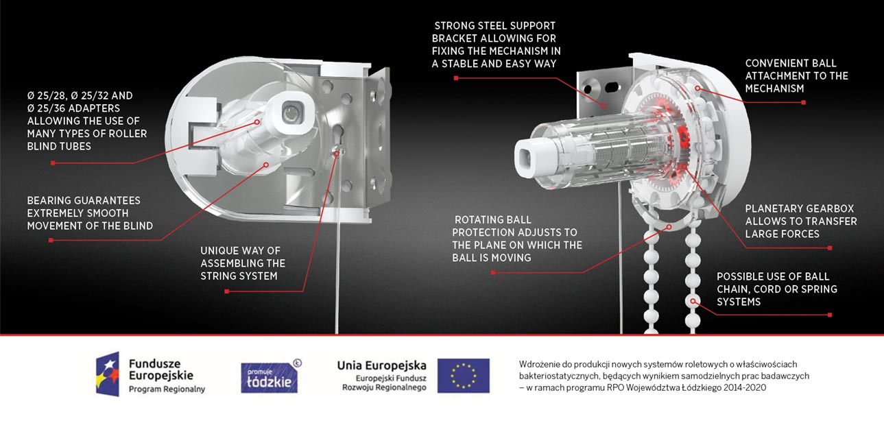 The versatility of the system allows for building various sizes of roller blinds: standard, day-night, internal and external screens, free hanging and cassette versions. Extremely durable mechanism with planetary gear, provides the possibility of producing exclusive, large-size blinds.